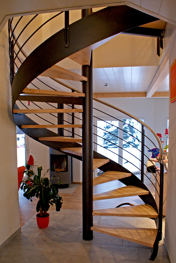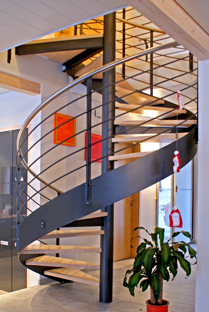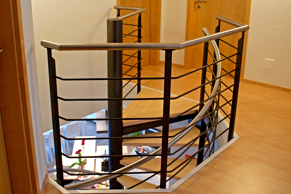 Voilà un escalier colimaçon avec un limon latéral en acier peint d'une peinture micassée noire.