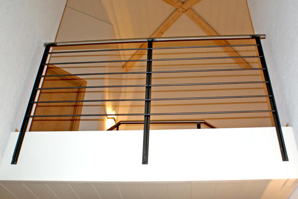 Les barrières sont en fer T avec un remplissage en filières horizontales rondes surmontées d'une main courante en tube inox.