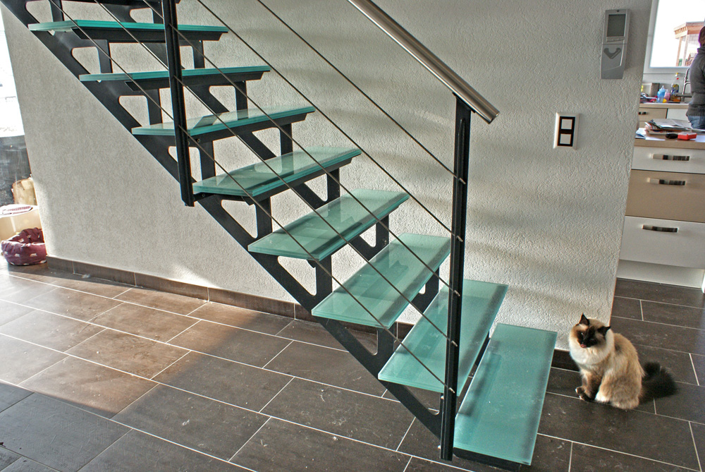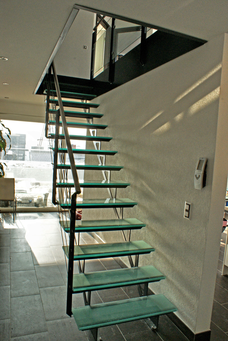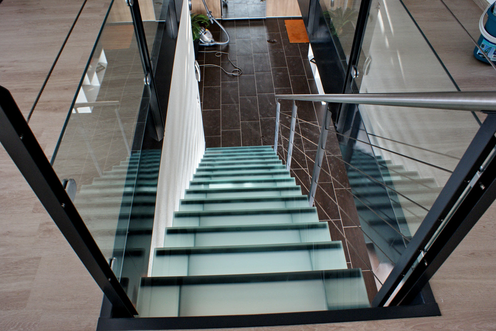 Escalier métallique à 2 limons découpés, avec marches en verre feuilleté mat.