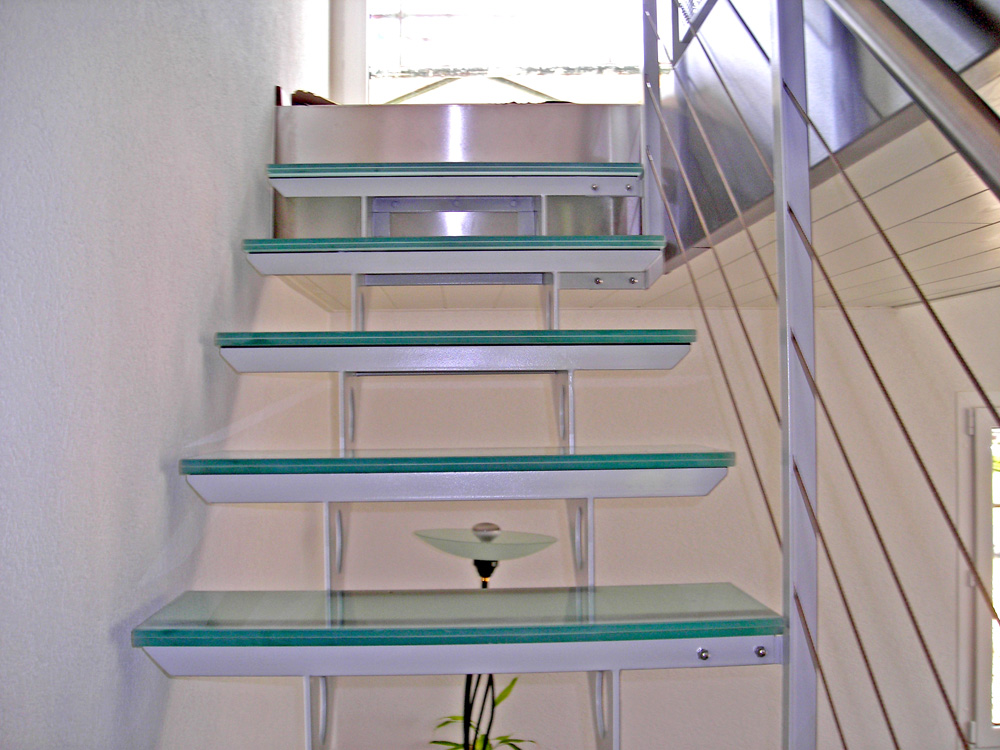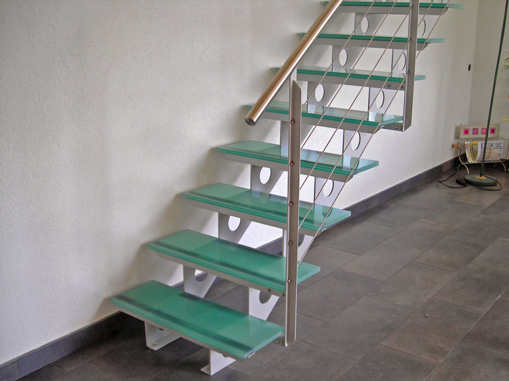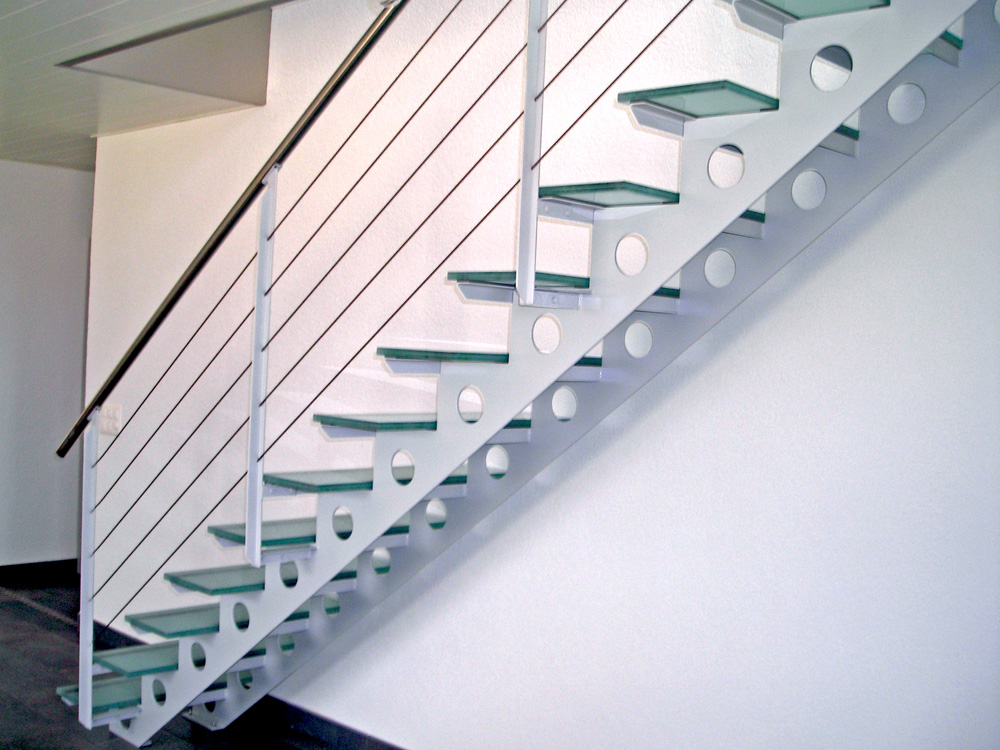 Voilà un escalier droit métallique avec marches en verre feuilleté mat, 2 limons découpés, balustrade en acier avec un remplissage en câble inox, main courante en inox brossé.