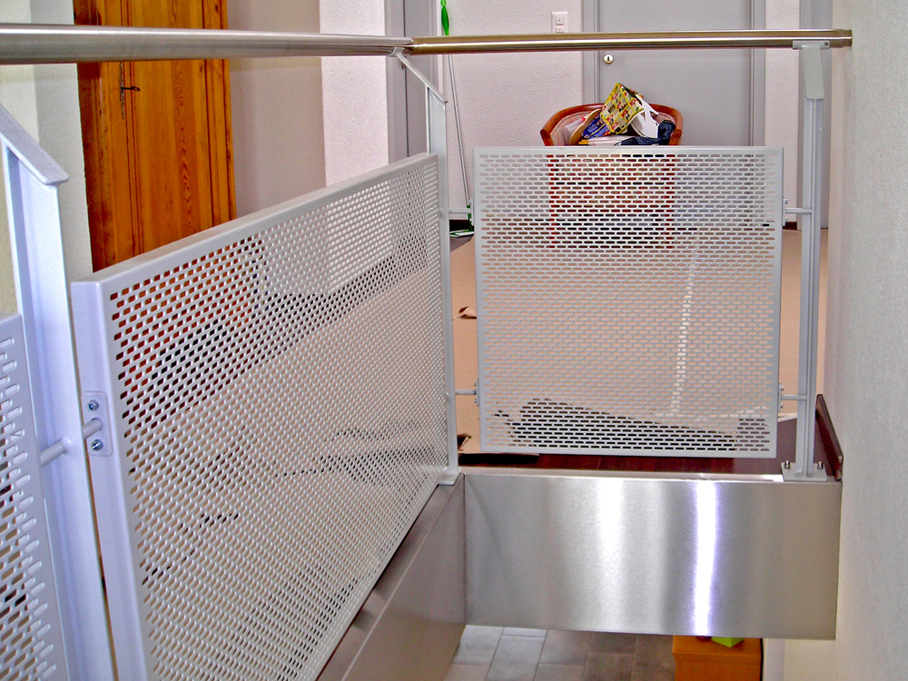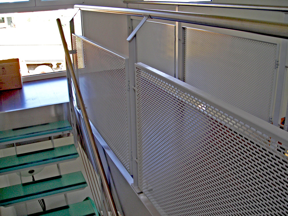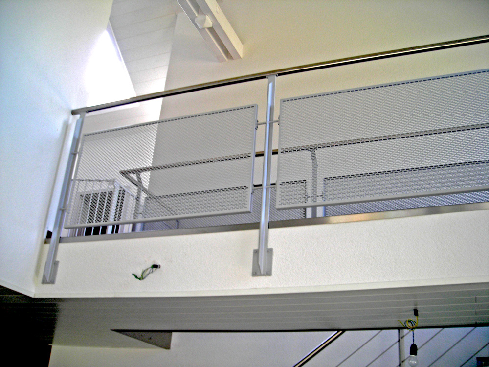 La balustrage de l'étage a un remplissage en tôle perforée, avec des trous oblongs, perforée sur mesure.
