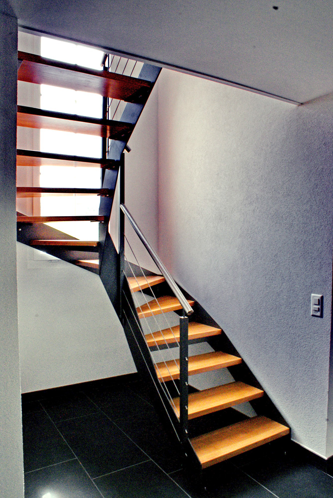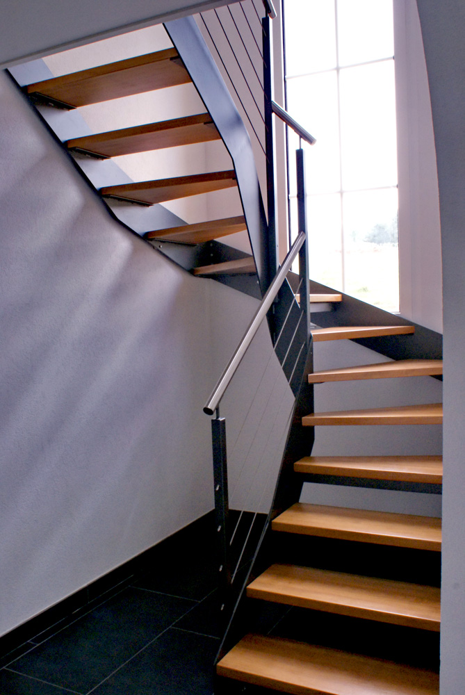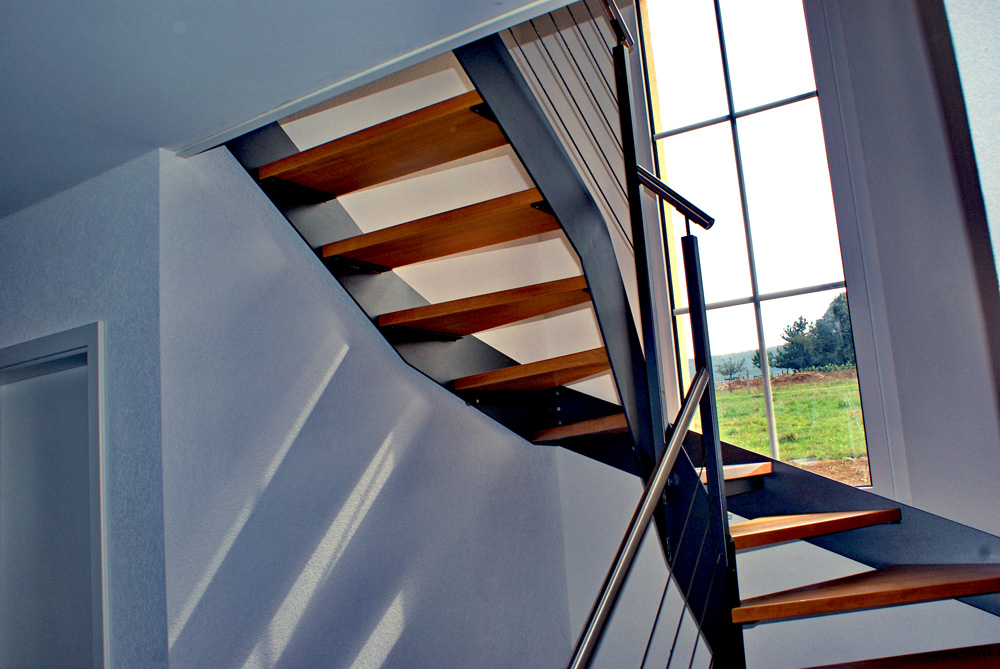 Il est d'une construction simple, avec 2 limons "droits" sur chaque côté cachant la tranche des marches en bois.