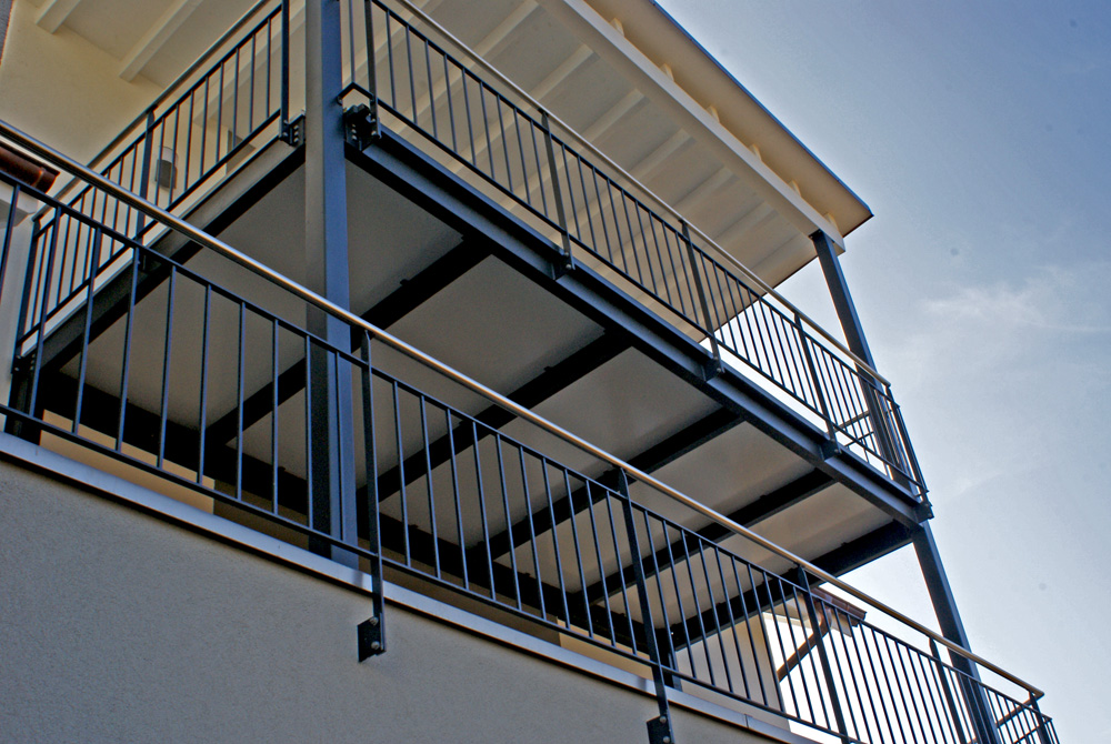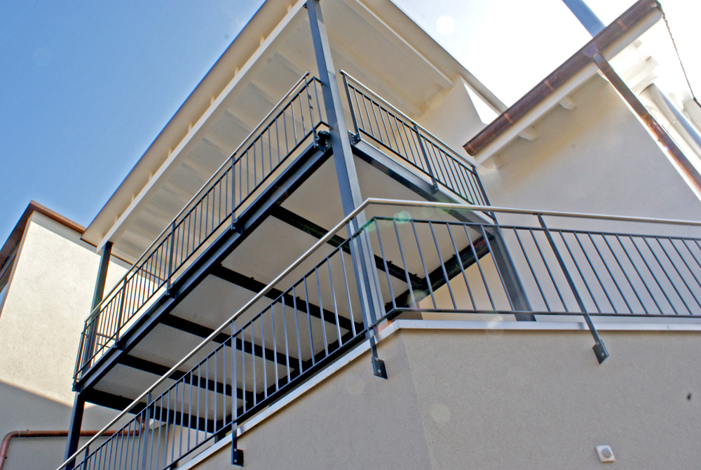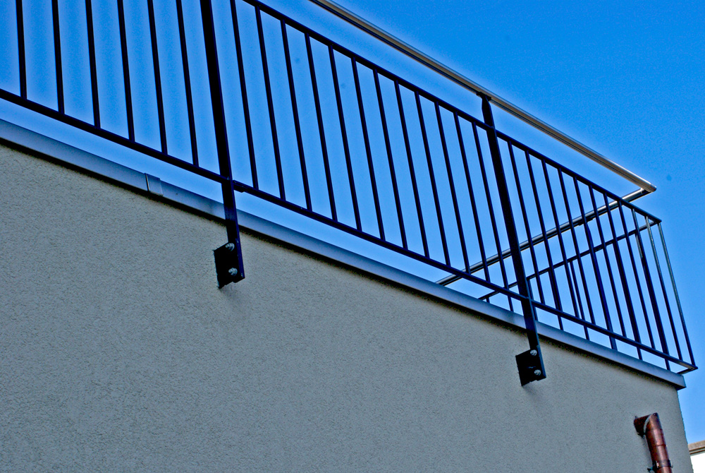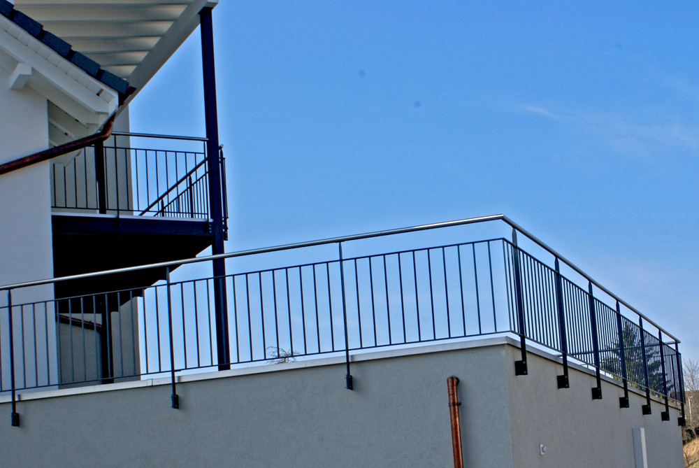 Les balustrades extérieures sont composées de poteaux en fer plat, avec des consoles de fixation spécialement étudiées pour ne pas gêner la pose d'insolation extérieure, nous avons 2 filières horizontales en fer plat et un remplissage en barreaux carré, le tout surmonté d'une main courante en acier inox brossé. Les parties en acier des barrières sont zinguées au feu puis peintes avec une peinture adaptée de couleur Ral 7016.