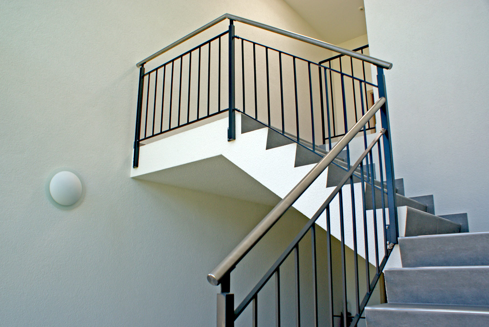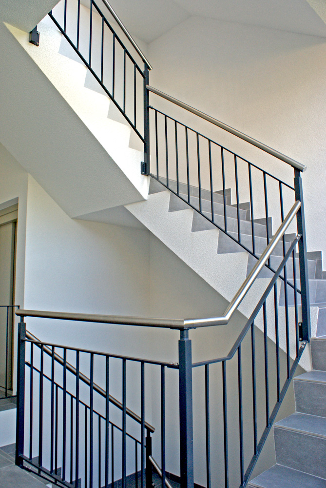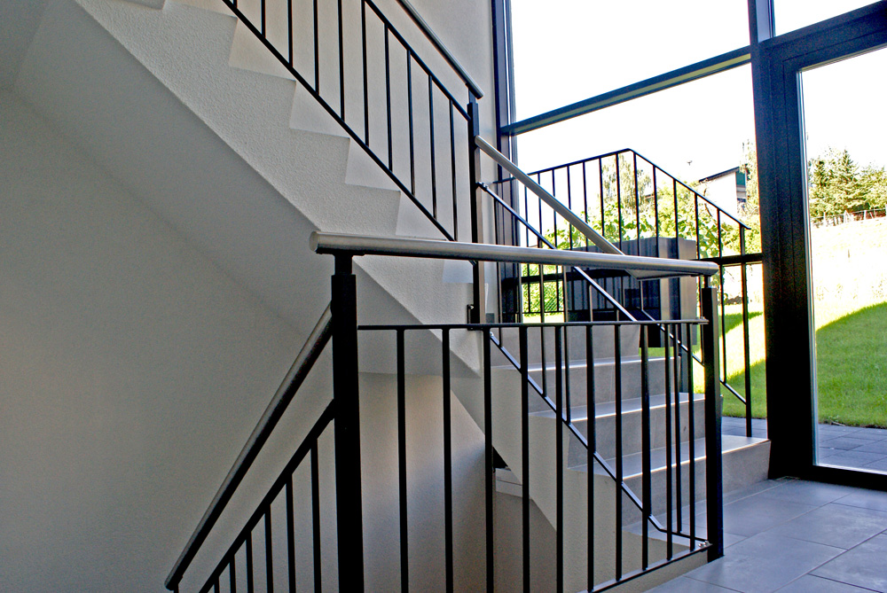 Les garde-corps intérieurs, dans la cage d'escalier, étaient à adapter sur le béton existant, ils sont de même aspect que les extérieurs, à la différence des poteaux qui sont en tube carré, ainsi que les parties acier sont simplement peintes (non zingués).